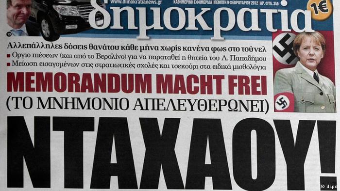 Meanwhile, philhellenist propaganda was used unsparingly on the eve of the German invasion of modern Greece in 1941, in order to convince Wehrmacht soldiers to consider themselves the ancient Greeks’ spiritual and biological heirs. Indeed, one could even argue that the brutality which German troops visited upon Greek civilians during World War II was in some cases a direct product of their disappointment at the modern Greeks’ failure to embody that heroic ideal which they had been conditioned to expect in the inhabitants of their ‘ancestral homeland’.(3) Angela Merkel’s routine portrayal as an SS-guard by the Greek press today is therefore, in some sense, a symptom of Greece’s troubled relationship with Germany’s philhellenist past, as well as with the memory of Nazi atrocities.