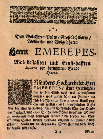 Printz, writing under the pseudonym “Phrynis of Mytilene”, addresses the dedication of his volume to one Herr Emerepes, the ‘well-cultivated and gravely-hated Ephor of the famed city of Sparta’. The entire two pages which follow constitute a sustained attack on the old-fashioned, fuddy-duddy mores of this pseudo-“Emerepes”, and conclude by dedicating the book to every man living – apart from‘His Lordship’, Emerepes himself.